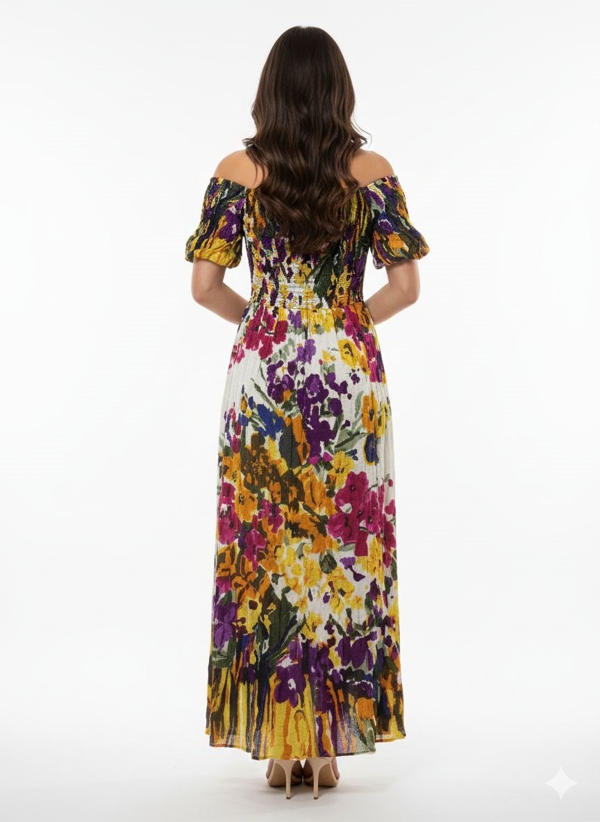 Brighten up your seasonal wardrobe with our Vibrant Multi-Color Floral Smocked Maxi Dress. Expertly crafted from a premium Rayon Cotton blend, this floor-length gown offers a luxurious, silky-soft feel with the breathable comfort of natural cotton. Featuring an explosion of rich botanical colors—including magenta, violet, sunflower yellow, and forest green—this dress is a stunning statement piece for summer weddings, garden parties, or tropical getaways.